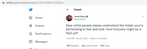 Samit Basu, an Indian novelist and filmmaker with 24K followers on Twitter, tweets: "Dear white people please understand the Indian you're befriending to feel and look more inclusive might be a Nazi.pdf"