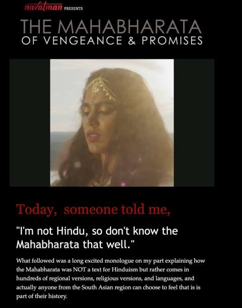 Navatman, an organization that calls itself “dedicated to South Asian performing arts”, and is based in NYC, released publicity material for their dance theater film – The Mahabharata of Vengeance & Promises.