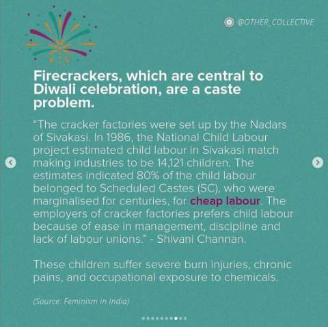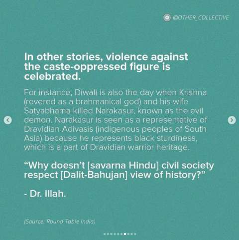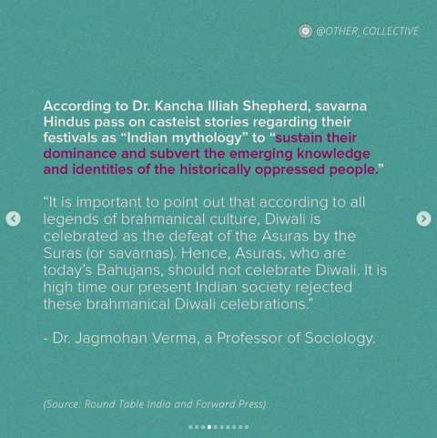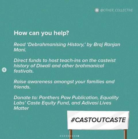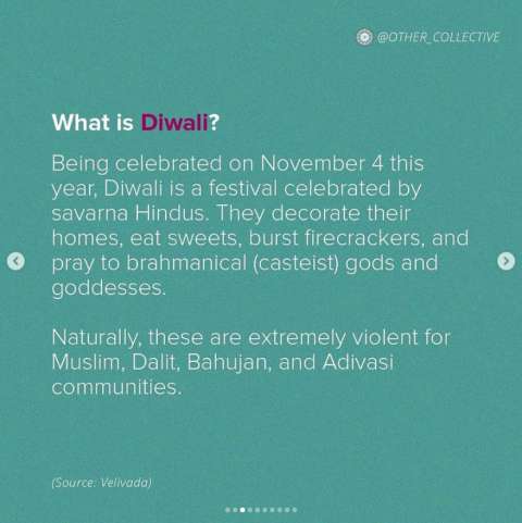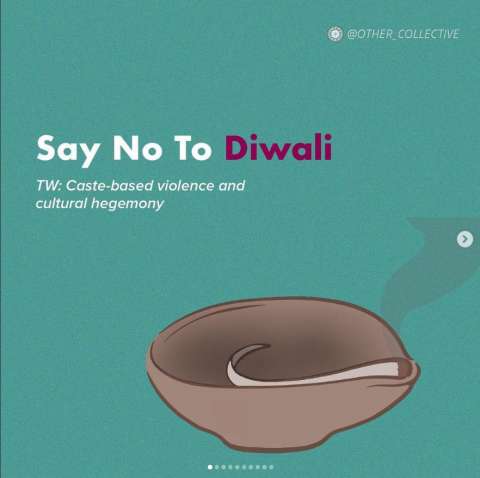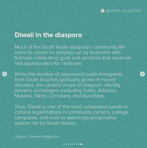 In an Instagram post on November 2nd, 2021, the account (@other_collective), a student-run organization in the University of California, Davis campus, said: “Diwali, also known as Festival of Lights, is celebrated by millions of South Asians annually. However, little attention is given to its casteist history and origins. Swipe to learn about why you should say no to Diwali this year and instead commit to the abolition of the caste system.”