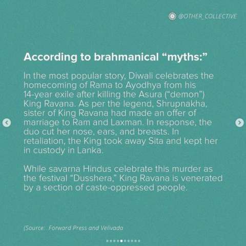 2) Diwali is celebrated as defeat of Asuras (today’s Bahujans, according to them) by Suras (Savarnas)
