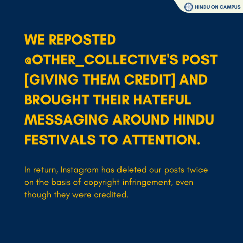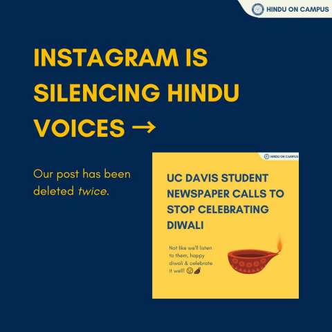 Upon highlighting the Hinduphobic post of "Other Collective", a student-run organization in UC Davis, that called for "Say No to Diwali" and maligned Hindus, the Instagram post of HinduOnCampus was deleted twice in spite of appropriate credits given for using the content of "Other Collective".