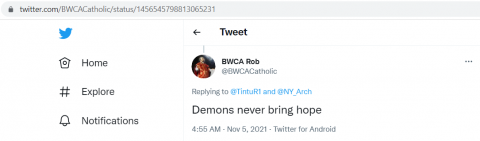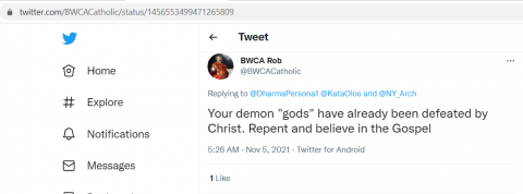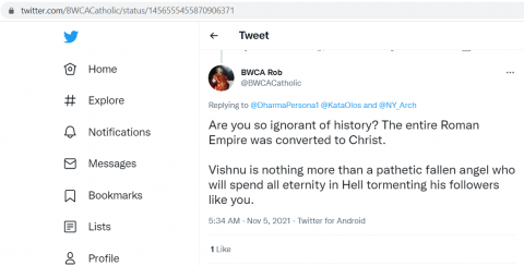 BWCA Rob, in response to a Twitter chain on The Archdiocese of New York’s Diwali greeting to Hindus, responds to a Hindu user in a tweet: “Your demon “gods” have already been defeated by Christ. Repent and believe in the Gospel.”