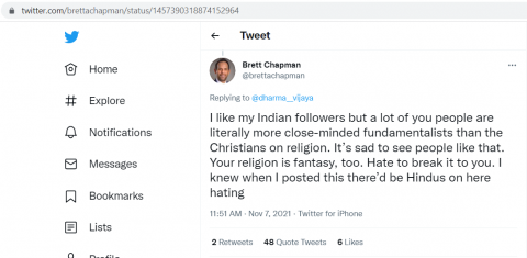Brett Chapman, a Native America Attorney in Tulsa, OK, with ~28K followers on Twitter, while responding to a Twitter user, tweets: “I like my Indian followers but a lot of you people are literally more close-minded fundamentalists than the Christians on religion. It’s sad to see people like that. Your religion is fantasy, too. Hate to break it to you. I knew when I posted this there’d be Hindus on here hating”.