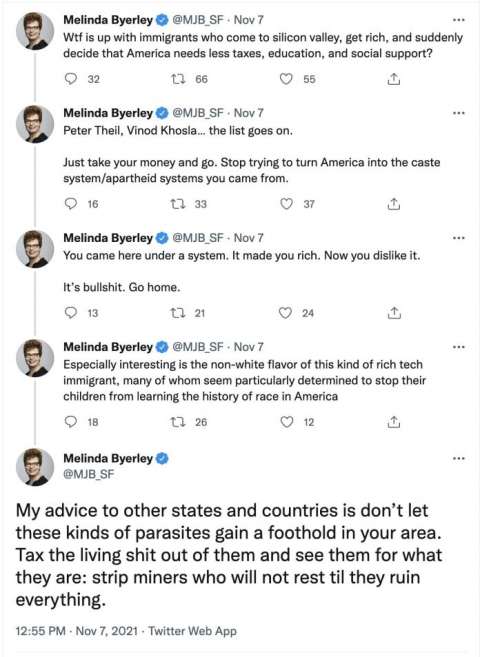 In a Twitter thread, Melinda Byerley, CEO and Co-Founder of Fiddlehead (a digital marketing consultancy), who also mentions “Diversity in Tech” in her Twitter bio, with more than 16K followers, based in San Jose, California, tweeted: “Wtf is up with immigrants who come to silicon valley, get rich, and suddenly decide that America needs less taxes, education, and social support? Peter Theil, Vinod Khosla… the list goes on. Just take your money and go. Stop trying to turn America into the caste system/apartheid systems you came from. You came here under a system. It made you rich. Now you dislike it. It’s bullshit. Go home. Especially interesting is the non-white flavor of this kind of rich tech immigrant, many of whom seem particularly determined to stop their children from learning the history of race in America. My advice to other states and countries is don’t let these kinds of parasites gain a foothold in your area. Tax the living shit out of them and see them for what they are: strip miners who will not rest til they ruin everything.