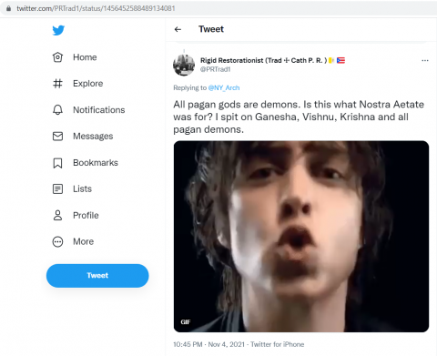 Rigid Restorationist, in response to The Archdiocese of New York’s Diwali greeting to Hindu, responds in a Tweet: “All pagan gods are demons. Is this what Nostra Aetate was for? I spit on Ganesha, Vishnu, Krishna and all pagan demons.” The account, based on the profile description that says “Católico ☧ Nacional-Sindicalista ⚒ Albizuista ☩ En / español #VivaPuertoRicoLibre”, seems to be based on Puerto Rico.