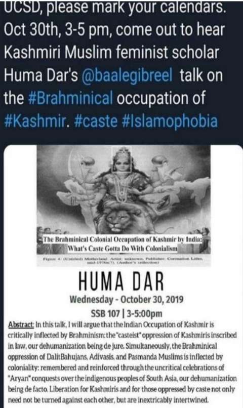 Huma Dar Slanders Hindus as Oppressing Kashmiris and Insinuates Hindus Being Outsiders (Aryans)