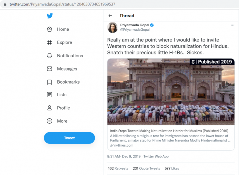 Priyamvada Gopal Calls Hindus Sickos, wants to Block Their Naturalization in US and Snatch Away Their H1Bs