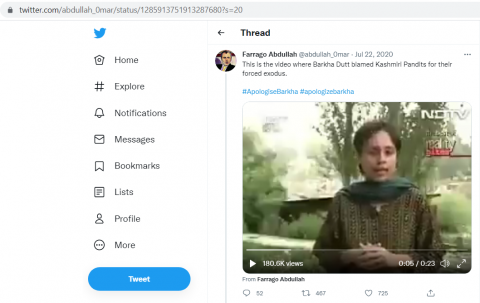 In a popular 23-second clip, Barkha Dutt describes:"Today hapless victims, they were once the privileged elites of the valley. They may have been a minority, but at that time they had monopolized government jobs, plum postings, and other such social benefits. In fact, the sharp economic disparity between the Pandits and the poor Muslim majority was one of the earliest reasons for popular discontent in the state" Websites like Alt News unsuccessfully tried to save Barkha Dutt by saying she has been quoted out of context as she was trying to give the contrast between the lives of Pandits before and after exodus.