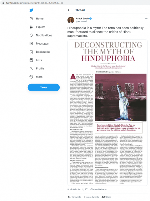 Sharing an image of his Gulf News article on the same topic, Ashok Swain, Professor of Peace and Conflict Research at Uppsala University, writes: "Hinduphobia is a myth! The term has been politically manufactured to silence the critics of Hindu supremacists."