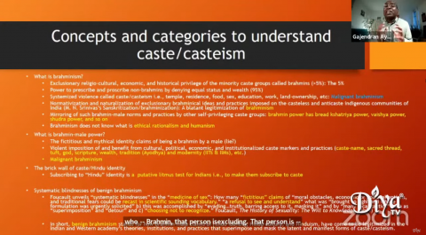 On Day 1, Session 3, Dr. Gajendran Ayyathurai, teacher and researcher at Centre for Modern Indian Studies, Göttingen University, Germany, said: “These guys are corporate malignant Brahmins. I was like “God!” – Sundar Iyer and Ramana Kompella. These two guys have been accused in Cisco in the US for identifying a colleague and calling him an untouchable and restricting him. Now, my question is, how are these guys different from any of us? And of all the places, in the US, in California, they are identifying themselves as Brahmins. I would ask them – do they have different form of pride? And then, this Iyer, this last name is very interesting for me. I am going to get back to it. So, there is Amar Diwakar, who has written about these guys. Please read. That’s why I have given the website. So, these last names – Iyers, Kompella, Trivedis, Sharmas, Mukherjees and so on – they seem to be violent advocates of this kind of malignant Brahminism, which we need to talk about more”