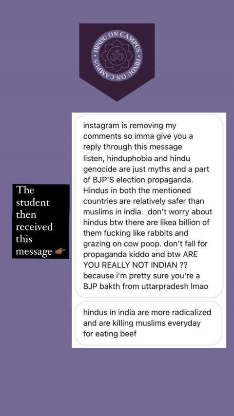 As his hateful comments got deleted, the Instagrammer DMed the Hindu student: "instagram is removing my comments so imma give you a reply through this message listen, hinduphobia and hindu genocide are just myths and a part of BJP'S election propaganda. Hindus in both the countries are relatively safer than muslims in India. don't worry about hindus btw there are likea billion of them fucking like rabbits and grazing on cow poop. don't fall for propaganda kiddo and btw ARE YOU REALLY NOT INDIAN?? because i'm pretty sure you're a BJP bakth from uttarpradesh imao.