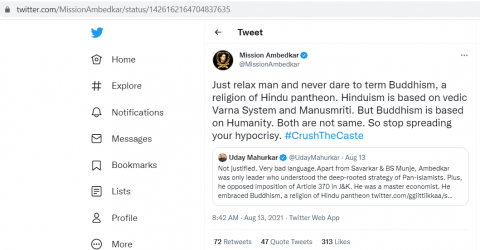 Mission Ambedkar, which identifies itself as a forum to spread Ambedkarism internationally and founded by Suraj Kumar Bauddh (https://twitter.com/SurajKrBauddh), with 45K+ followers on Twitter, tweeted: "Just relax man and never dare to term Buddhism, a religion of Hindu pantheon. Hinduism is based on vedic Varna System and Manusmriti. But Buddhism is based on Humanity. Both are not same. So stop spreading your hypocrisy. #CrushTheCaste"