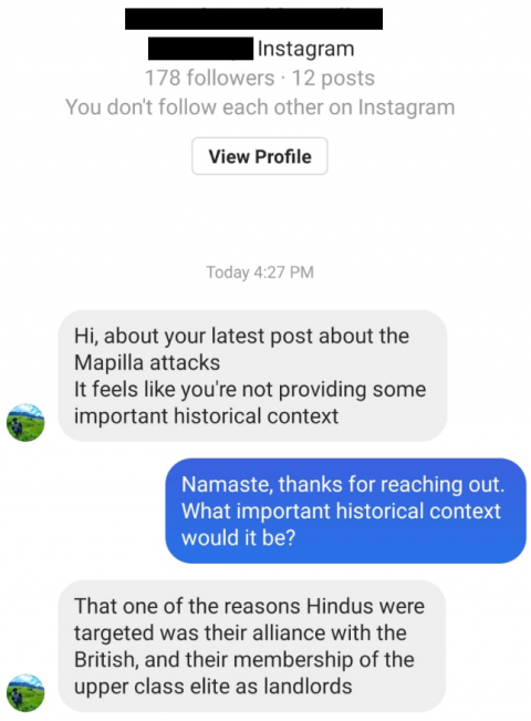 In response to CoHNA's Instagram post on the anniversary of the Mapilla Hindu Genocide of 1921, an Instagram user responded (in two messages)