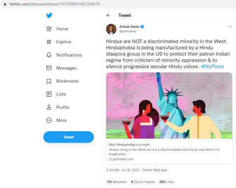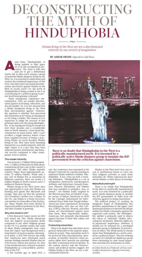 The article authored by Ashok Swain on July 19, 2021 calls Hinduphobia a politically manufactured myth. Denies Hinduphobia