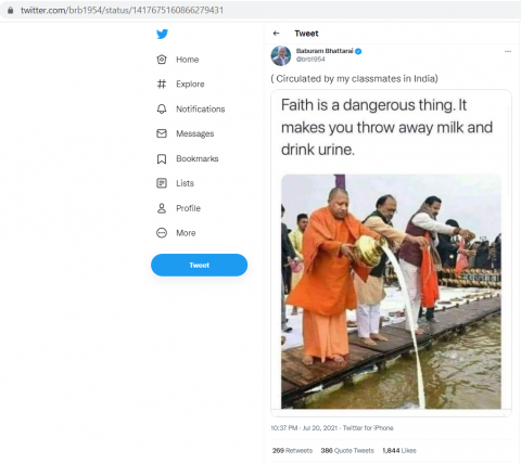Dr. Babyram Bhattarai, former Prime Minister of Nepal, with 1.3 million followers in Twitter, shared the image of the Uttar Pradesh Chief Minister Yogi Adityanath and other leaders offering milk to the river. The image caption said, “Faith is a dangerous thing. It makes you throw away the milk and drink urine.” Dr. Baburam Bhattarai is the former PM of Nepal from August 2011 to March 2013. He completed his PhD degree from Jawaharlal Nehru University (New Delhi) in 1986. He is the federal Chairman of Janta Samajbadi party who was Prime Minister of Nepal from August 2011 to March 2013. He was a long-time leading member of the Unified Communist Party of Nepal (Maoist) prior to founding a new party, Naya Shakti.