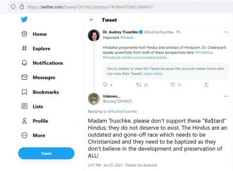 Audrey Truschke shared a tweet by Ananya Chakravarti (https://twitter.com/achakrava/) - Associate Prof at Georgetown University History Department - "explaining" how Hindutva proponents hurt Hindus and scholars of Hinduism. The Twitter user Sunny tweeted: "Madam Truschke, please don't support these "Ba$tard" Hindus; they do not deserve to exist. The Hindus are an outdated and gone-off race which needs to be Christianized and they need to be baptized as they don't believe in the development and preservation of ALL!"