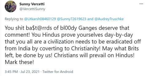 Audrey Truschke shared a tweet by Ananya Chakravarti (https://twitter.com/achakrava/) - Associate Prof at Georgetown University History Department - "explaining" how Hindutva proponents hurt Hindus and scholars of Hinduism. In response, Sunny Vercetti (now deleted account) tweeted: "You shit ba$t@rrds of bl00dy Ganges deserve that comment! You Hindus prove yourselves day-by-day that you all are a civilization needs to be eradicated off from India by converting to Christianity! May what Brits left, be done by us! Christians will prevail on Hindus! Mark these!"