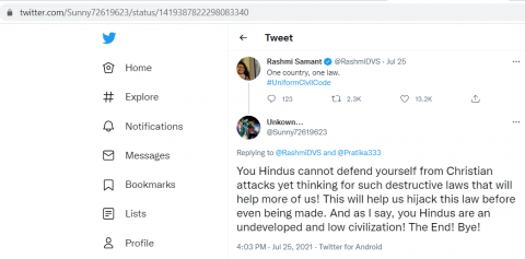 In response to Rashmi Samant's tweet (https://twitter.com/RashmiDVS/status/1419275334478966790) on Uniform Civil Code, the Twitter user Sunny tweeted: "You Hindus cannot defend yourself from Christian attacks yet thinking for such destructive laws that will help more of us! This will help us hijack this law before even being made. And as I say, you Hindus are an undeveloped and low civilization! The End! Bye!"